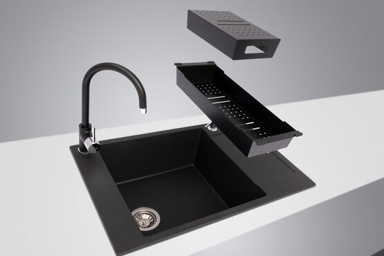 - nově ke dřezům kompletní nabídka černých komponentů, tj. kromě baterií i černý dávkovač, doplňky a příslušenství, jako např. sítko, miska, přepad, ovladač výpusti