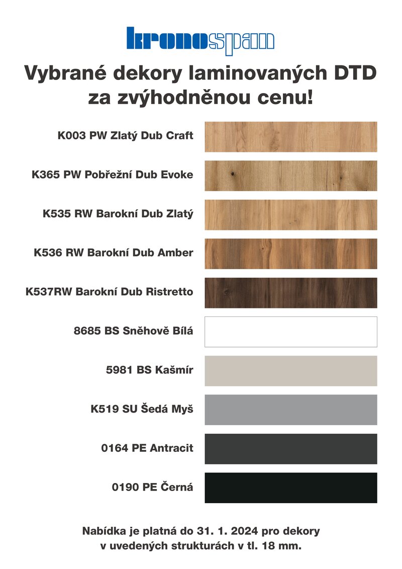 Využijte zvýhodněných cen vybraných dekorů laminovaných DTD od Kronospanu.