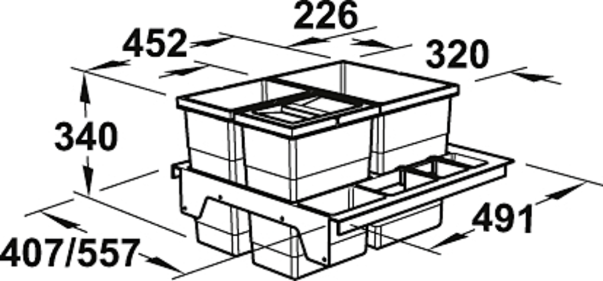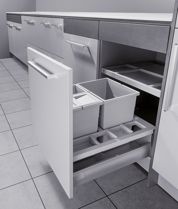 Häfele 502.03.553 / 3-místný odpadkový koš Seperato-K 3620-61 pro montáž s výsuvnými systémy, pro šířku korpusu 600 mm, 1x18 a 2x8 L, světle šedá