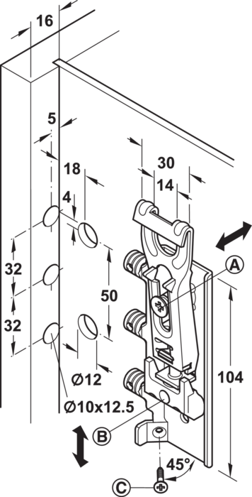 > nastavení výšky a hloubky přes vyvrtané otvory Ø 12 mm