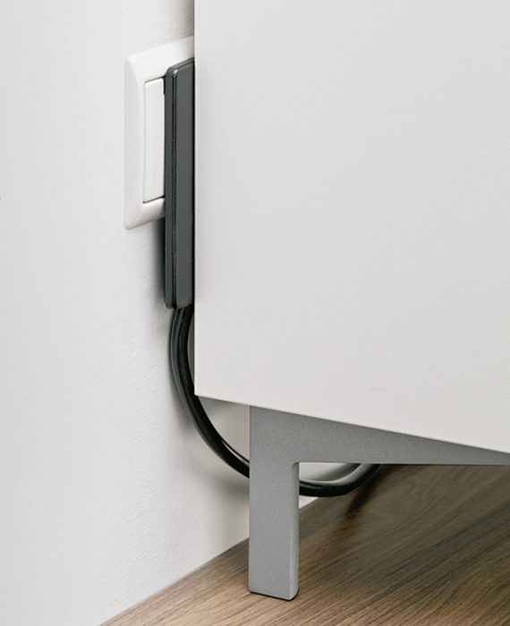 > tenký design umožňuje použití zásuvek, které jsou za nábytkem, a přesto ponechat nábytek přisunutý téměř ke stěně