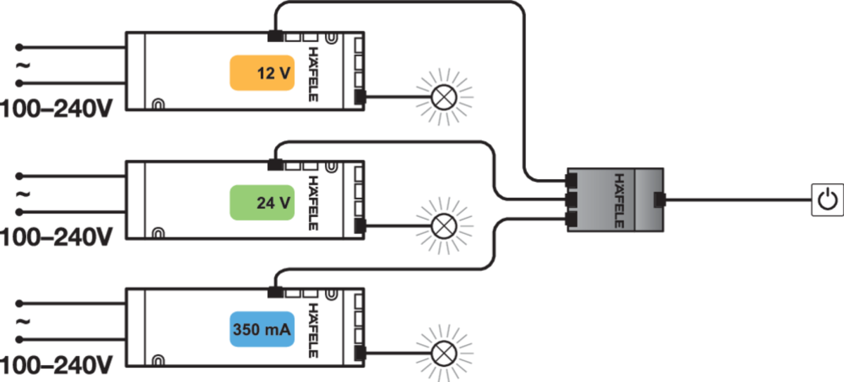 - 1 spínačem lze ovládat až 3 Drivery (různá napětí) nebo rozbočovače s funkcí spínače = jedním spínačem lze zapnout a vypnout několik svítidel v místnosti