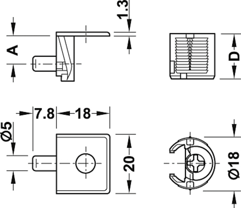 Häfele 263.67.537 / Spojovací kování pro korpusy a police Tab 18, se zajištěním, k naražení do otvoru o průměru 5 mm, pro tloušťku materiálu 16 mm, niklováno