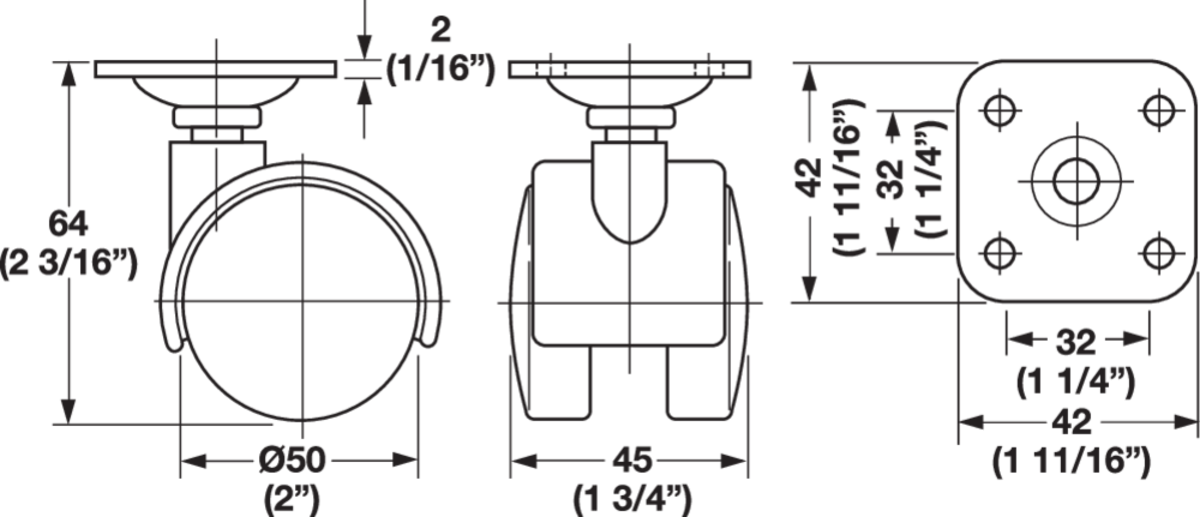Häfele 660.08.321 / Dvojité nábytkové kolečko, otočné, s krytem, s brzdou, s montážní deskou, nosnost cca 40 kg, průměr kolečka 50 mm
