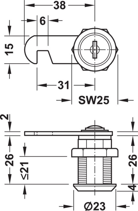 Häfele 235.19.200 / Nábytkový jazýčkový zámek Econo s pevnou plátkovou vložkou, s montážní maticí, s jazýčkovým háčkem