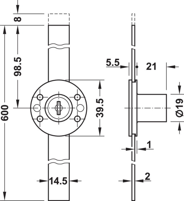 Häfele 237.68.600 / Centrální otočný zámek Econo s předmontovanou zamykací tyčí, délka 600 mm, s pevnou plátkovou vložkou