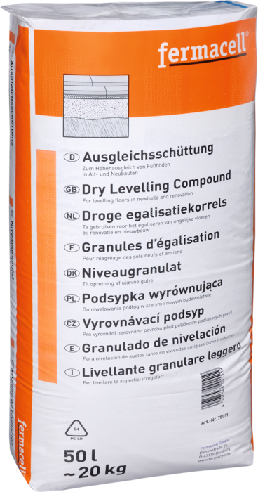 Speciálně sušený, minerální a soudržný granulát. Třídy reakce na oheň A1. K vyrovnávání nerovností až do 100 mm u oblasti použití 1. cca. 400 kg/m³.