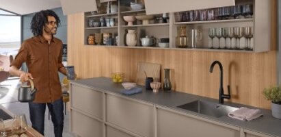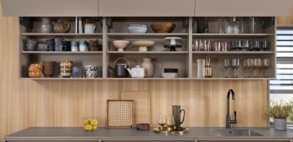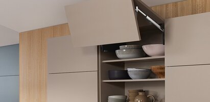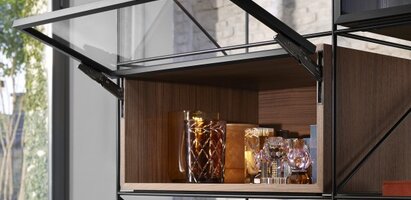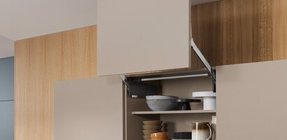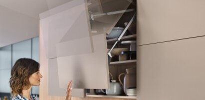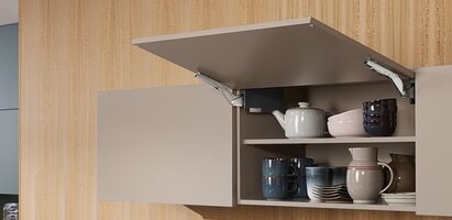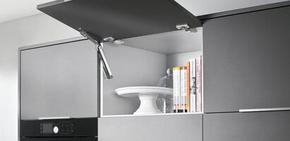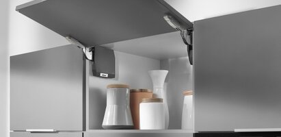 Díky precizně navrženému kování můžete efektně upravit vzhled celých místností. Zdvihací mechanismus je ukrytý za hedvábně bílými, světle šedými nebo tmavě kovově šedými krycími prvky - buď laděnými do stejného odstínu jako okolní nábytek, nebo sloužícími jako poutavý kontrast. Vaše vlastní designové prvky s logem dodají kolekci AVENTOS top zcela originální vzhled.