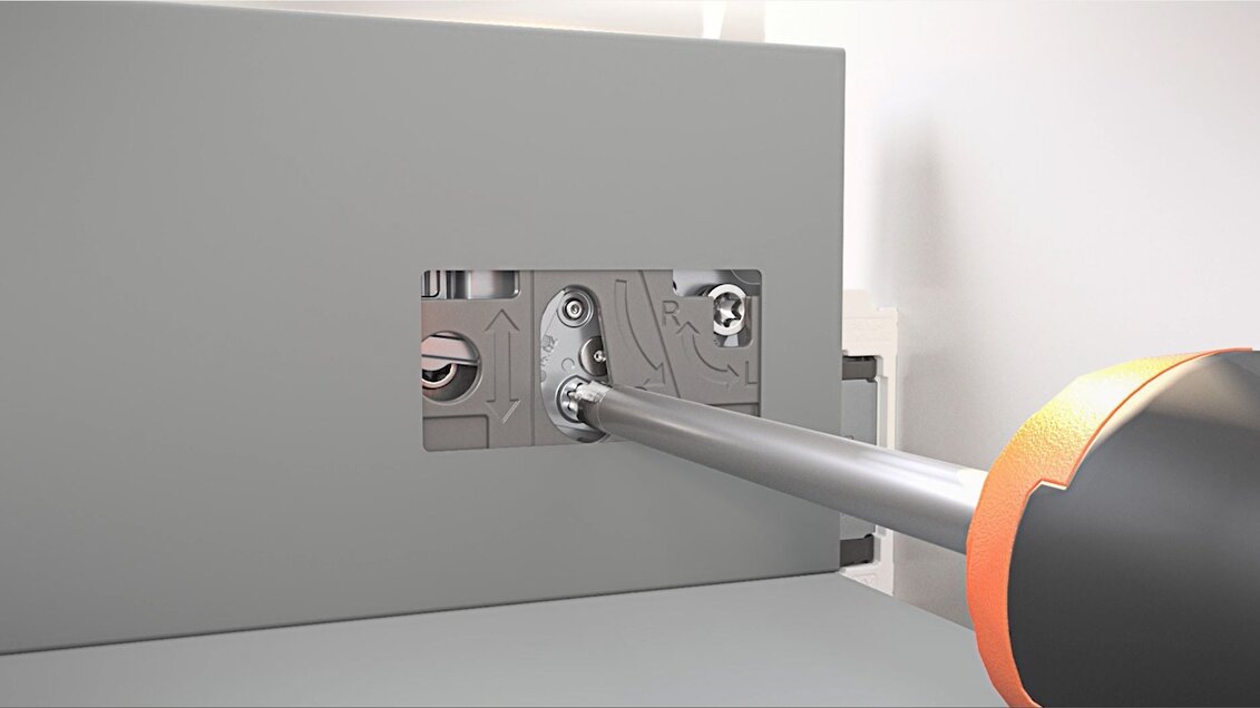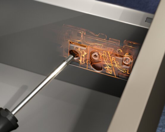 Seřízení systému MERIVOBOX je prováděno pomocí speciálních nástrojů, které zajišťují jednoduché a přesné nastavení. Není potřeba žádných složitých nářadí ani zkušeností s montáží nábytku.