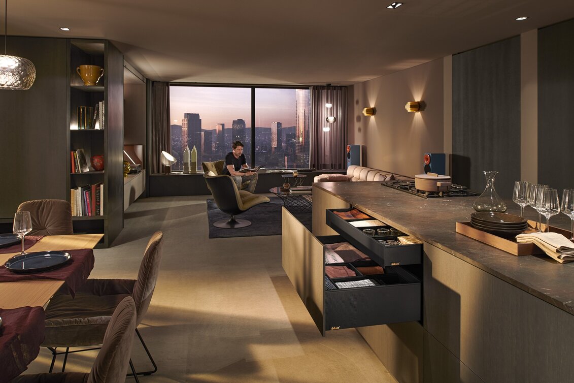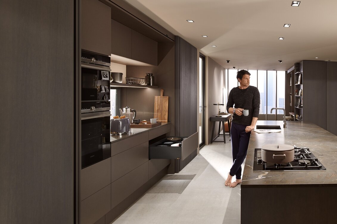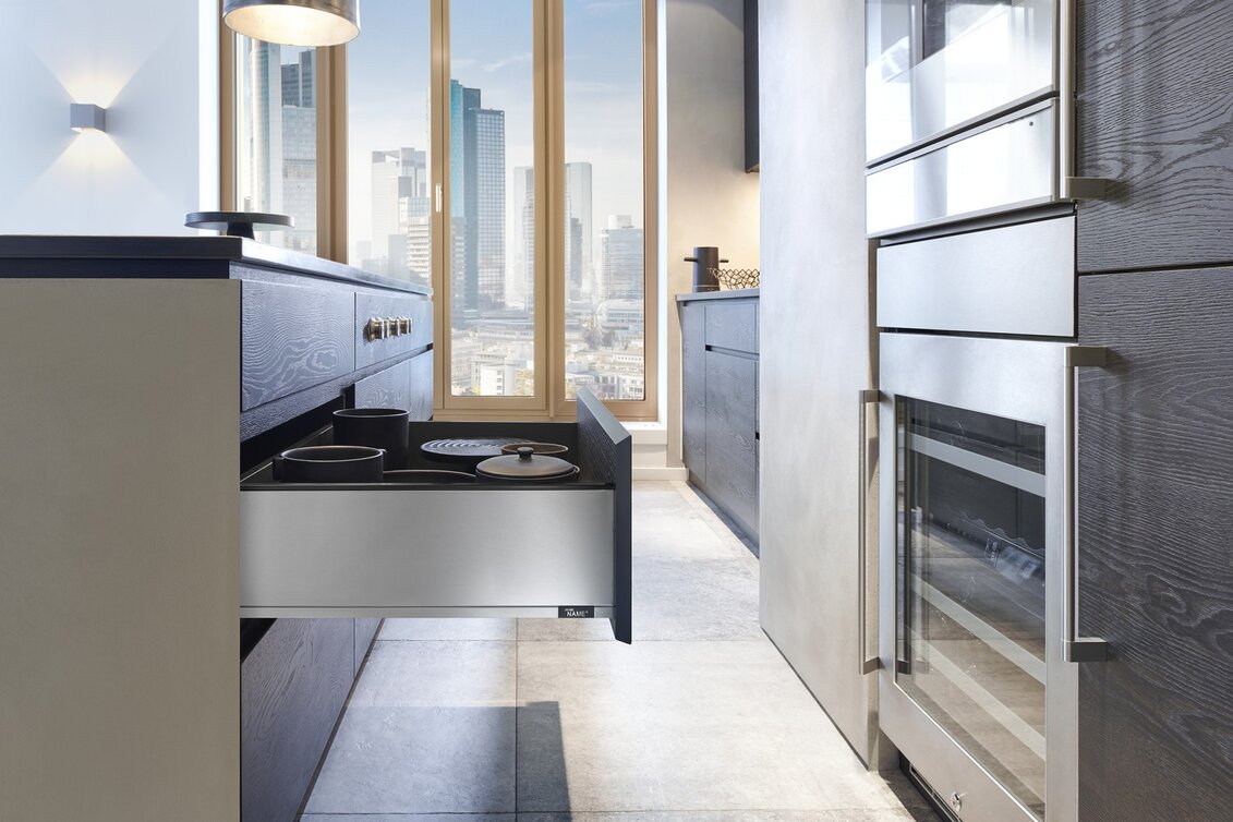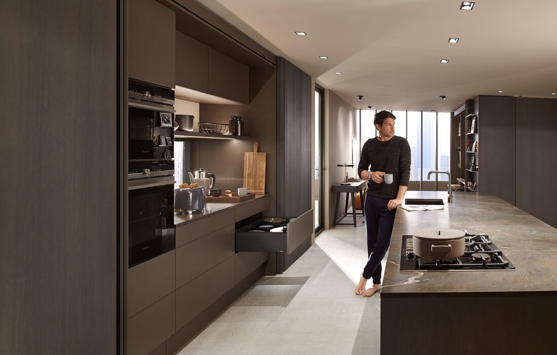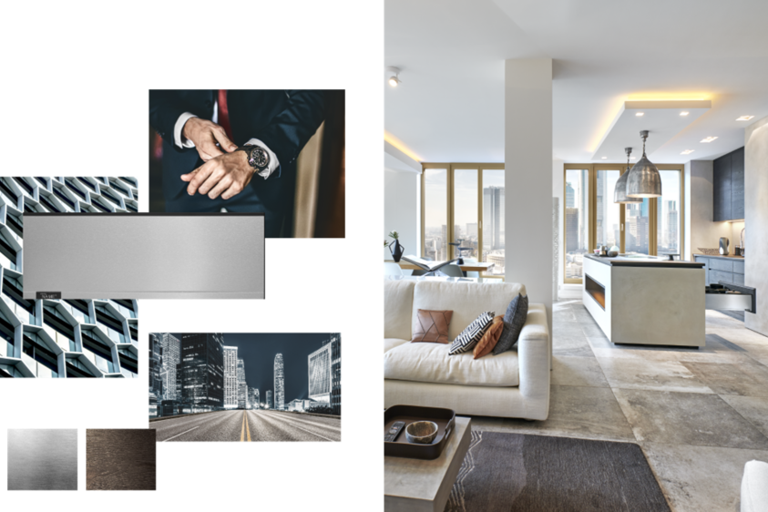 Tato kombinace metalických povrchů a tlumených barev dosahuje úžasné souhry. Lesklá vnější část z ušlechtilé nerez oceli s anti fingerprint efektem vytváří zářivý protiklad s decentním vnitřním prostorem, který je laděn do karbonově černé matné barvy.