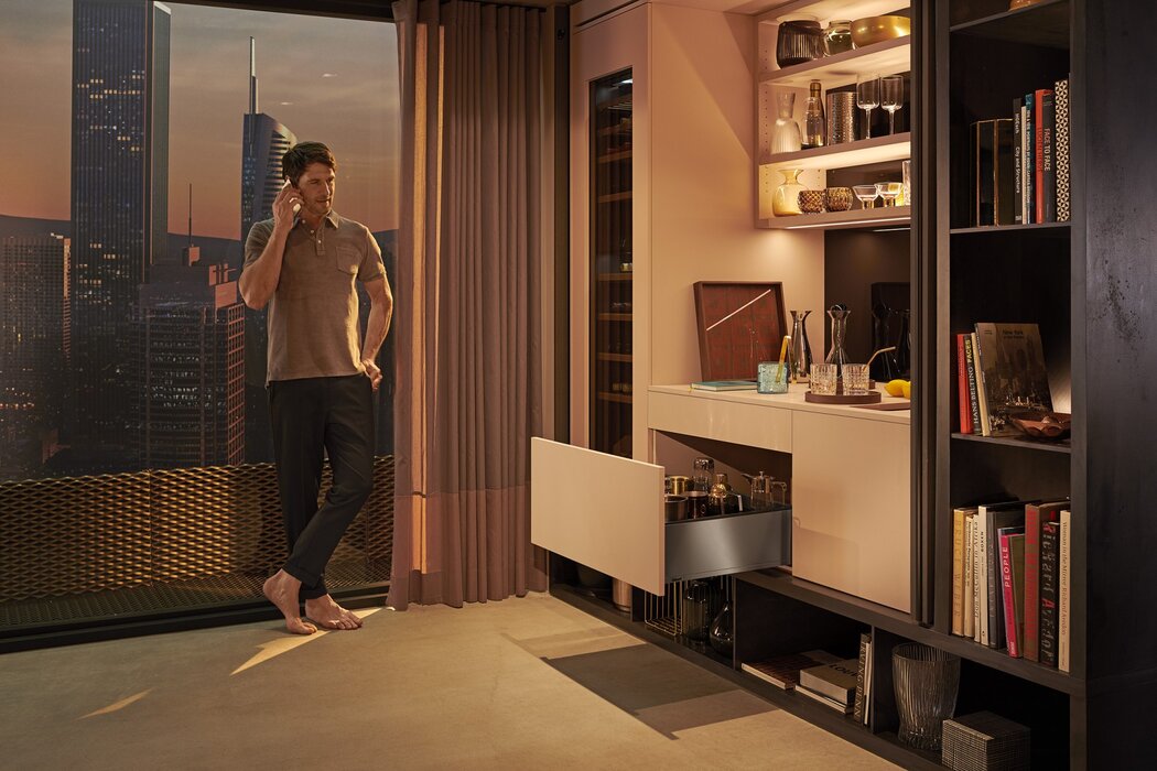 Působivá struktura povrchu, která vybízí k doteku, a svůdná hra tmavých barev jsou prvky, které okouzlují. Karbonově černý matný vzhled s efektem Carbon look přidává nábytku stylový vzhled, zejména v kombinaci s prvkem pro umístění loga ve zlaté barvě.