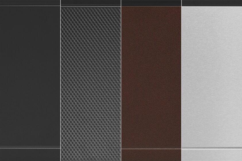Zleva - karbonově černá matná, carbon look v barvě karbonově černé matné, ušlechtilá rez a ušlechtilá nerez ocel s anti fingerprint povrchem.
