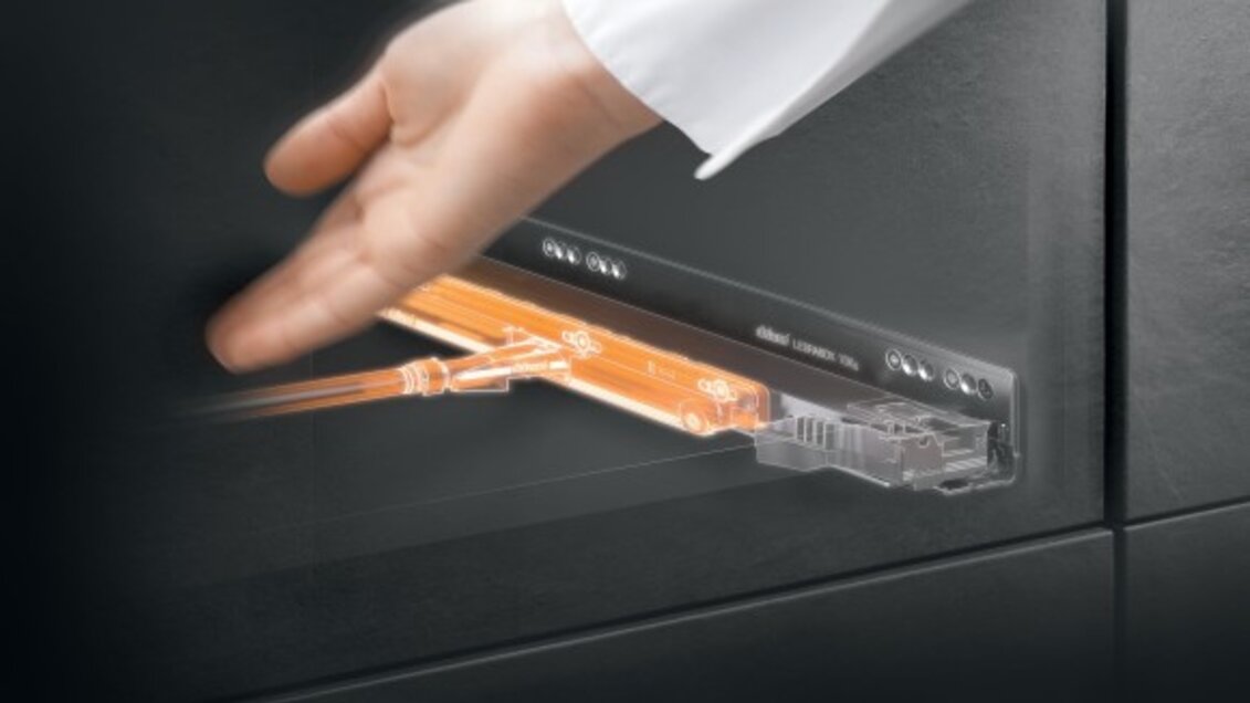Bez ohledu na to, zda se jedná o dvířka, výklopy nebo systémy výsuvů, bezúchytkový nábytek lze jednoduše otevřít pomocí mechanické funkce TIP-ON – stačí na něj jemně ťuknout. Pro zavření stačí lehce zatlačit na čelo nábytku. Mechanismus TIP-ON zůstane plně funkční i tehdy, když nábytek zavíráte ručně, třeba tahem za dvířka, výklopy nebo výsuvy.