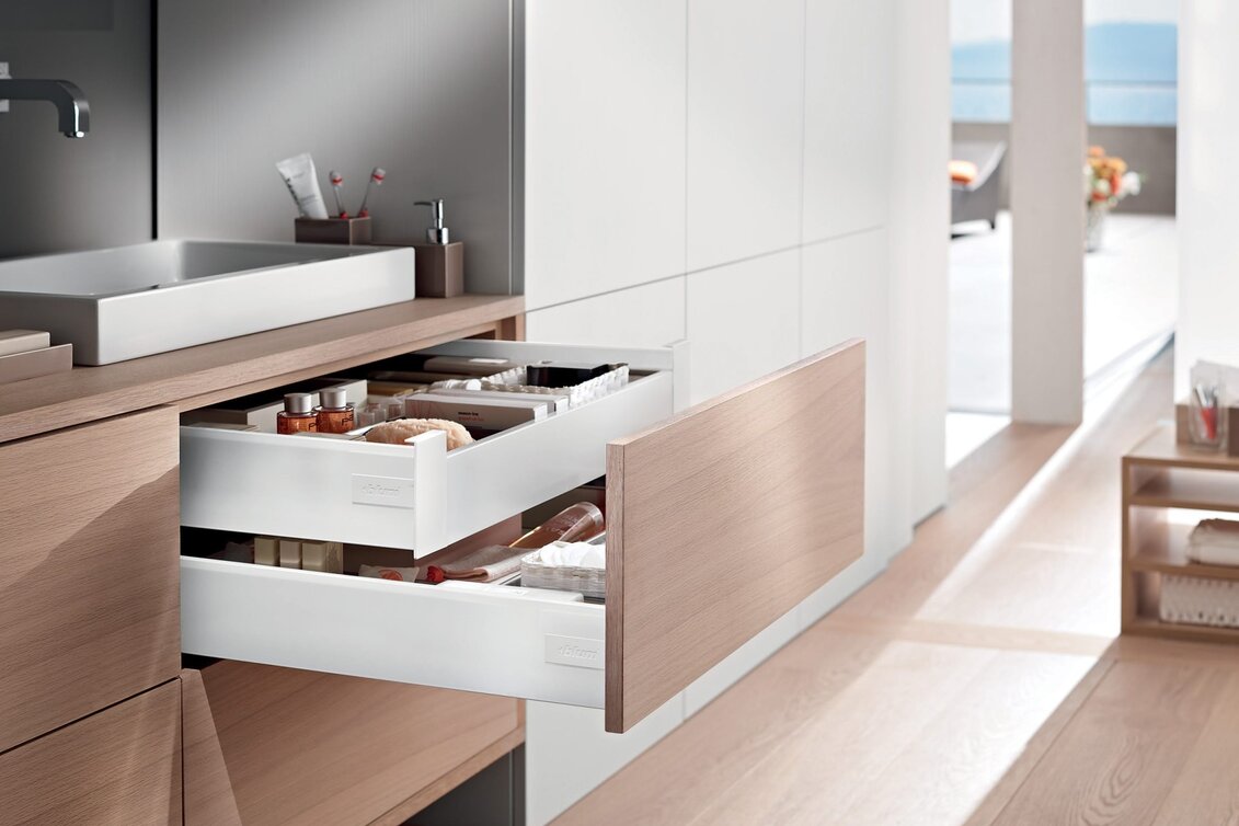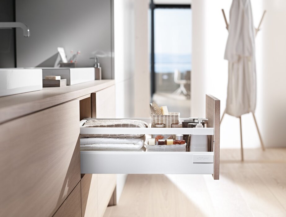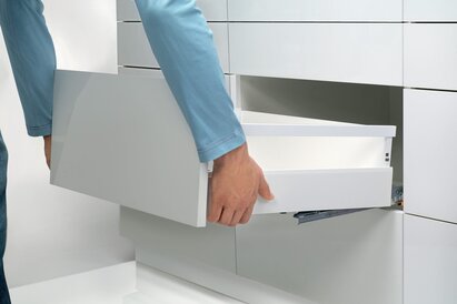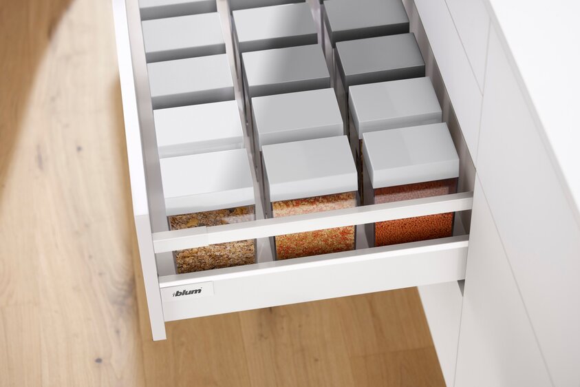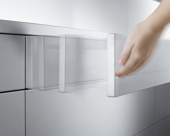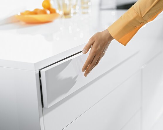 Jasný a čistý design s hranatým relingem je typický pro TANDEMBOX antaro. Díky tomuto provedení může nábytek nabídnout jednotný vzhled, který se táhne od výsuvu až po bočnici.