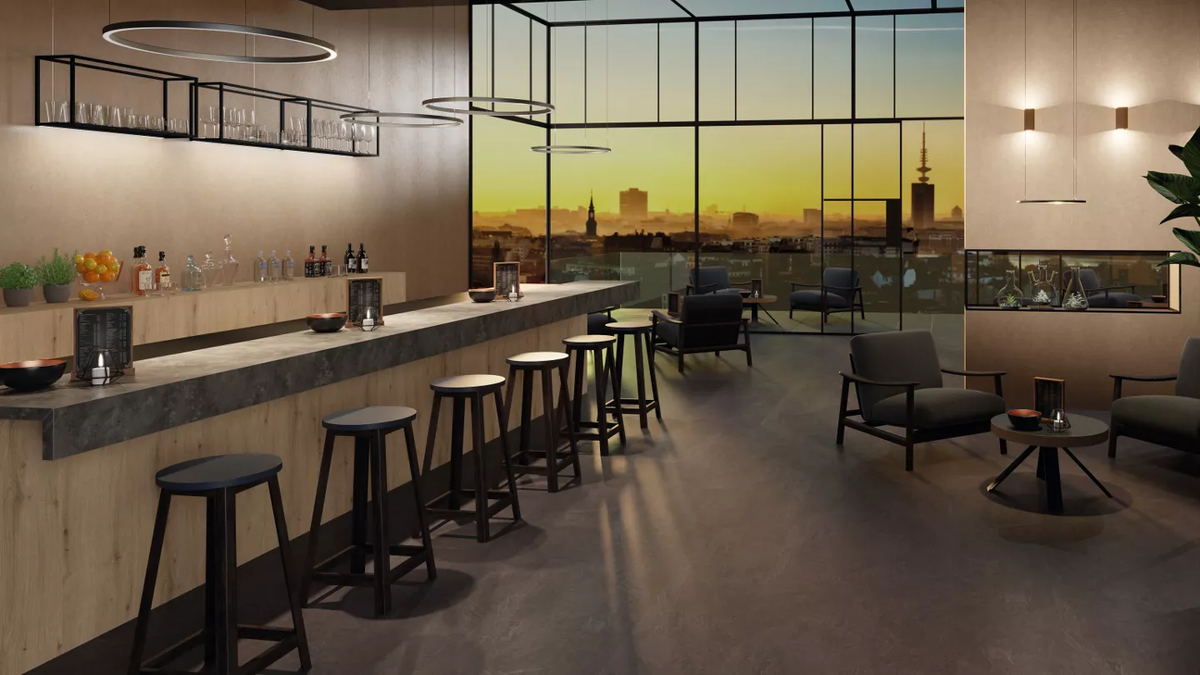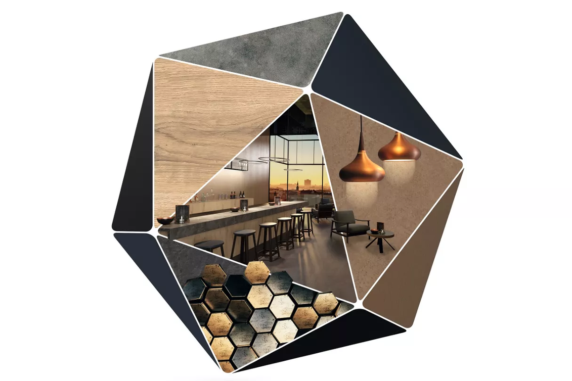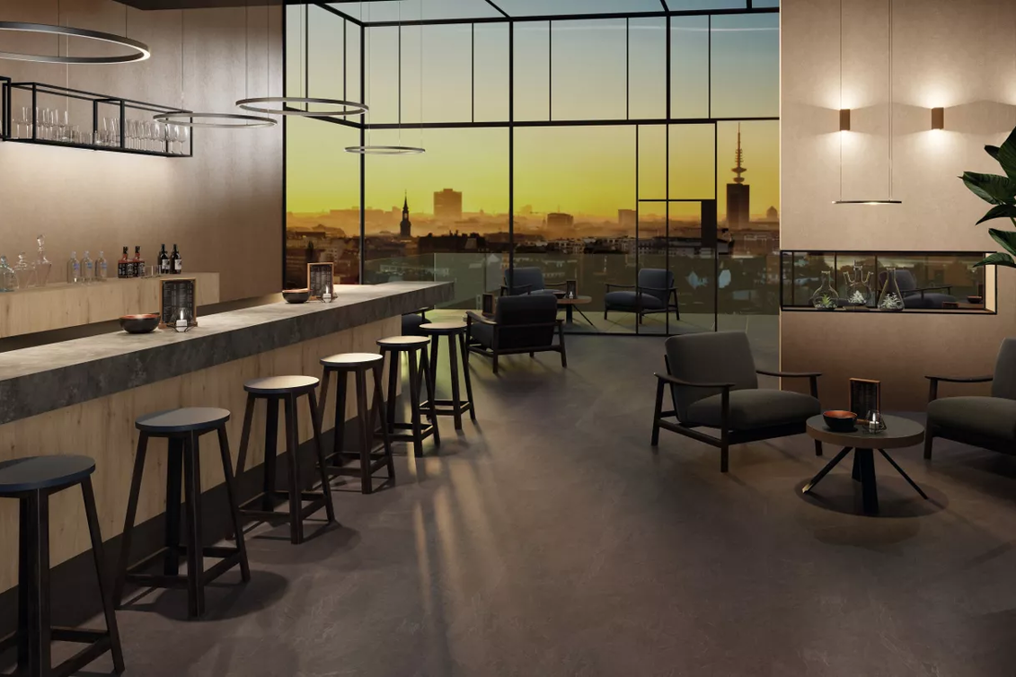 Veřejné interiéry také stále častěji vyžadují klidné a teplé materiály. Teplé dřevo se světlými přírodními prvky působí přirozeně, ale ne příliš rustikálně. Vzrušující kovové efekty vyzařují eleganci, zejména ve veřejných prostorech, jako jsou restaurace. Kamenné efekty s teplou hrou barev v kombinaci s tmavými uni barvami mohou dodat místnostem působivý celkový dojem.